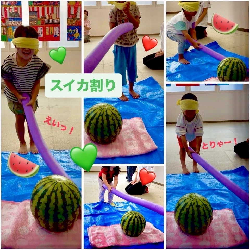 目隠しをしてお友だちの声を頼りにスイカを目指しました。