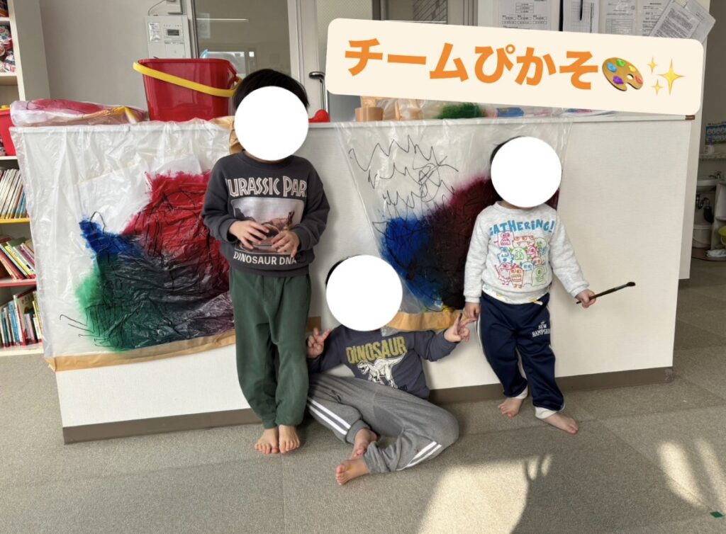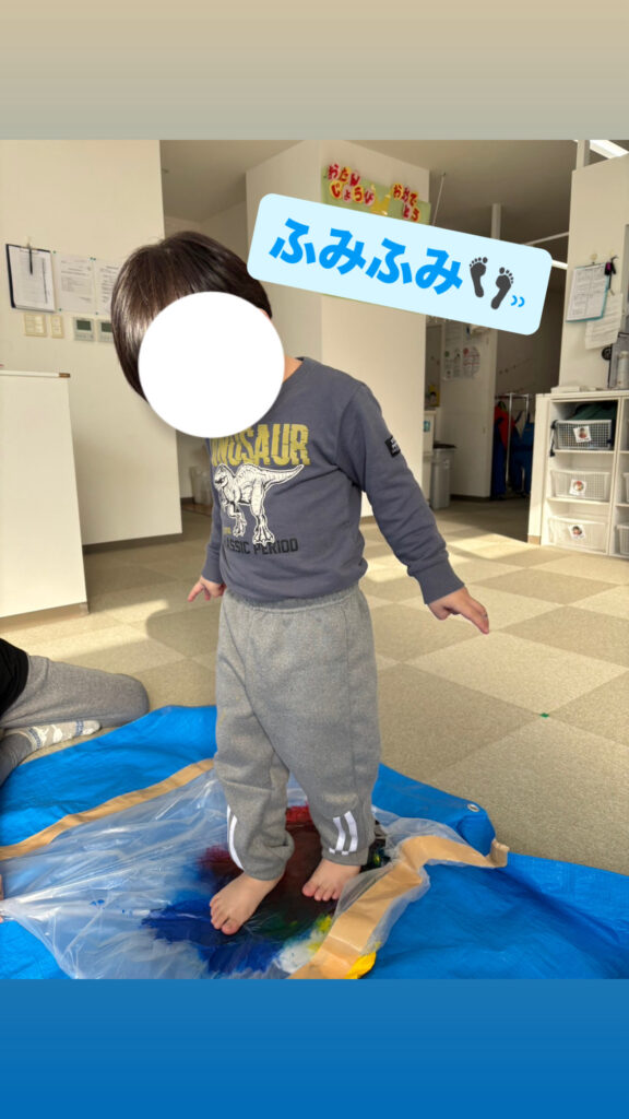 ポリ袋に絵の具と紙を入れ、袋の上から踏み広げることで